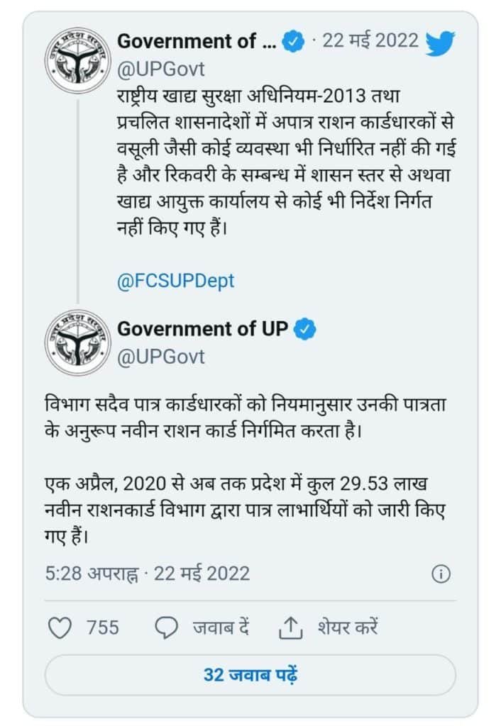 उत्तर प्रदेश की सरकार ने रिकवरी के दावों पर भी अपना स्पष्टीकरण जारी किया. और कहा कि – राष्ट्रीय खाद्य सुरक्षा अधिनियम-2013 तथा प्रचलित शासनादेशों में अपात्र राशन कार्डधारकों से वसूली जैसी किसी भी प्रकार की व्यवस्था को निर्धारित नहीं किया गया इसके साथ ही सरकार ने रिकवरी के सम्बन्ध में सभी दावो को झूठा व् भ्रमित करने वाला बताया है. सरकार ने यह सभी जानकारी अपने ट्विटर अकाउंट के द्वारा साझा की और रिकवरी के दावों से किया इंकार.