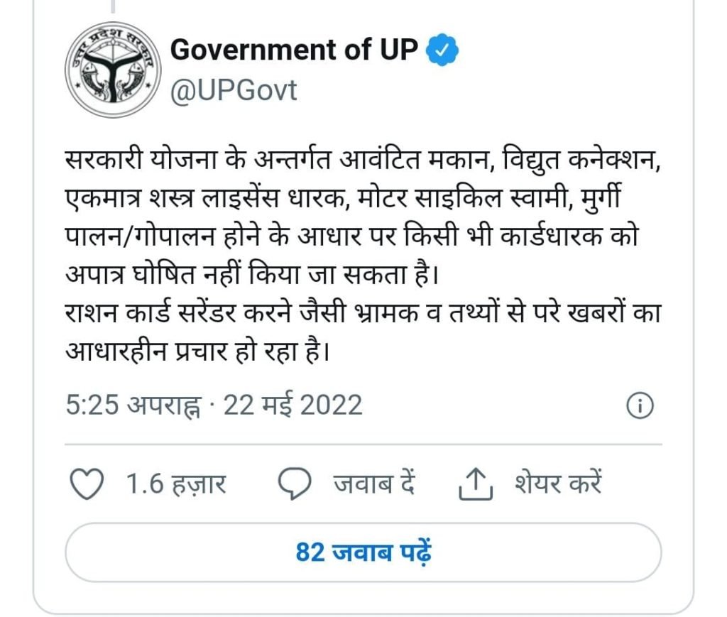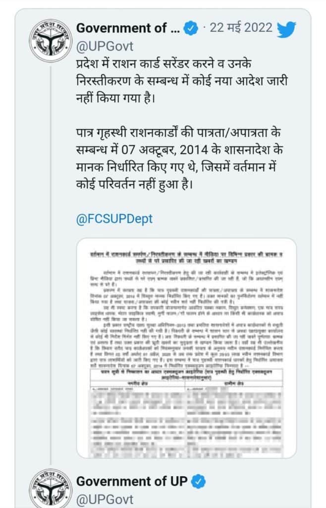 यूपी सरकार ने रविवार को यह स्पष्ट किया कि उत्तर प्रदेश राज्य में Ration Card Surrender करने या रद्द करने के संबंध में अभी कोई भी नया आदेश जारी नहीं किया गया है. |